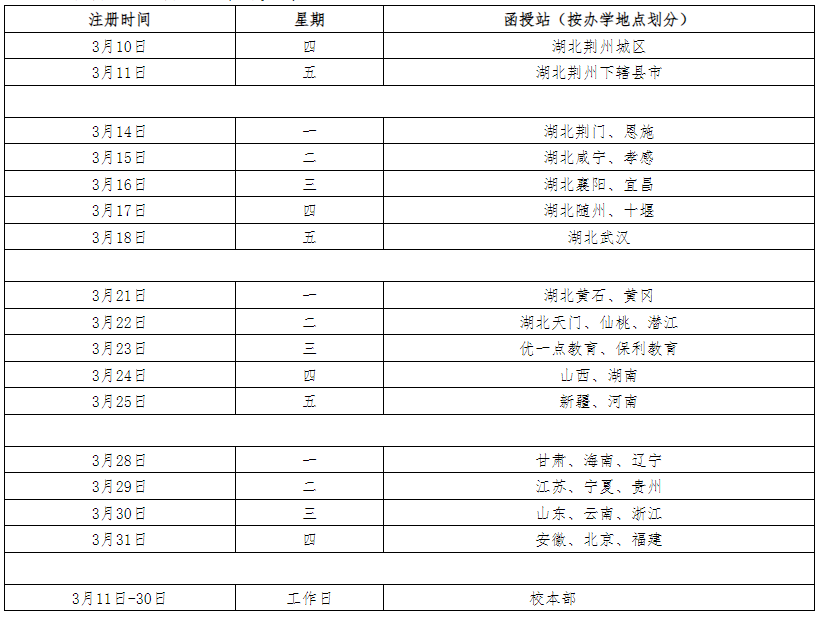 2、注册工作3月10日开始,站点按注册时间与招办核对注册名单,依据为《入学资格复查信息汇总表》,联系电话:0716-8067312。