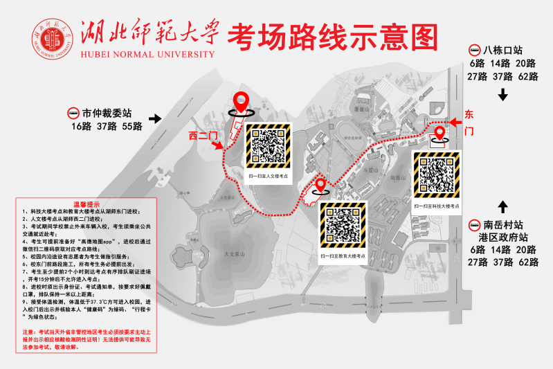 1.考试当天,考生可从学校东大门(正门)及西二门进出。从东大门进校的考生,进校后参考《考场路线示意图》根据指示牌前往各自对应考场。