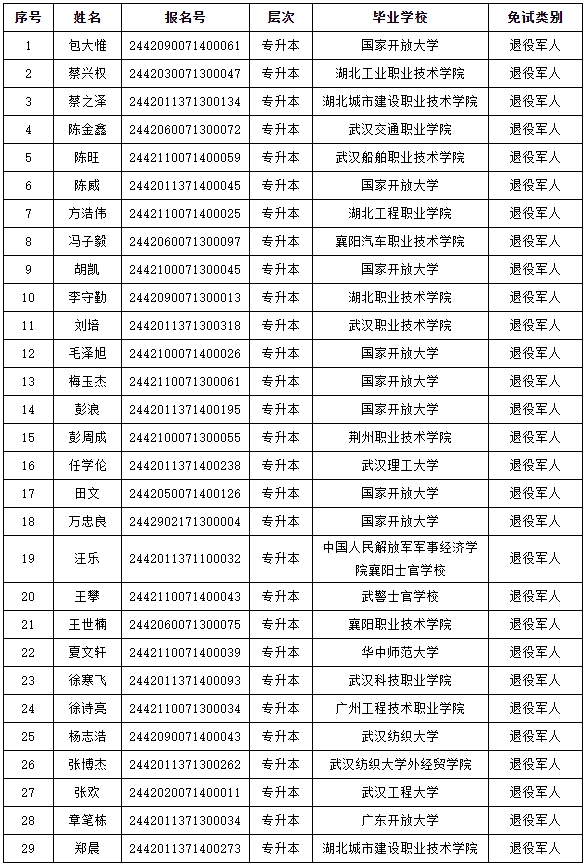 根据湖北省《省教育考试院关于做好2024年成人高考报名工作的通知》(鄂学考[2024]6号)有关要求以及省招办统一部署,经学校初审,现将符合成人高等教育免试入学条件考生公示如下: