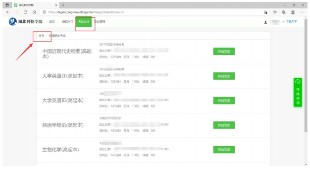 (3)登录后点击“我的考试”,在“补考”里即可查看所要考试的课程