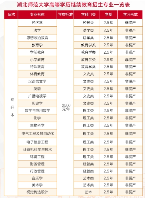 湖北师范大学高等学历继续教育依托学校雄厚的师资力量和优良的办学条件,经多年的积累和沉淀,形成了颇具特色的学科专业品牌。学校现在成人高等教育专业43个,学科门类广,学习层次多样,人才培养质量高,毕业生社会认可度高。